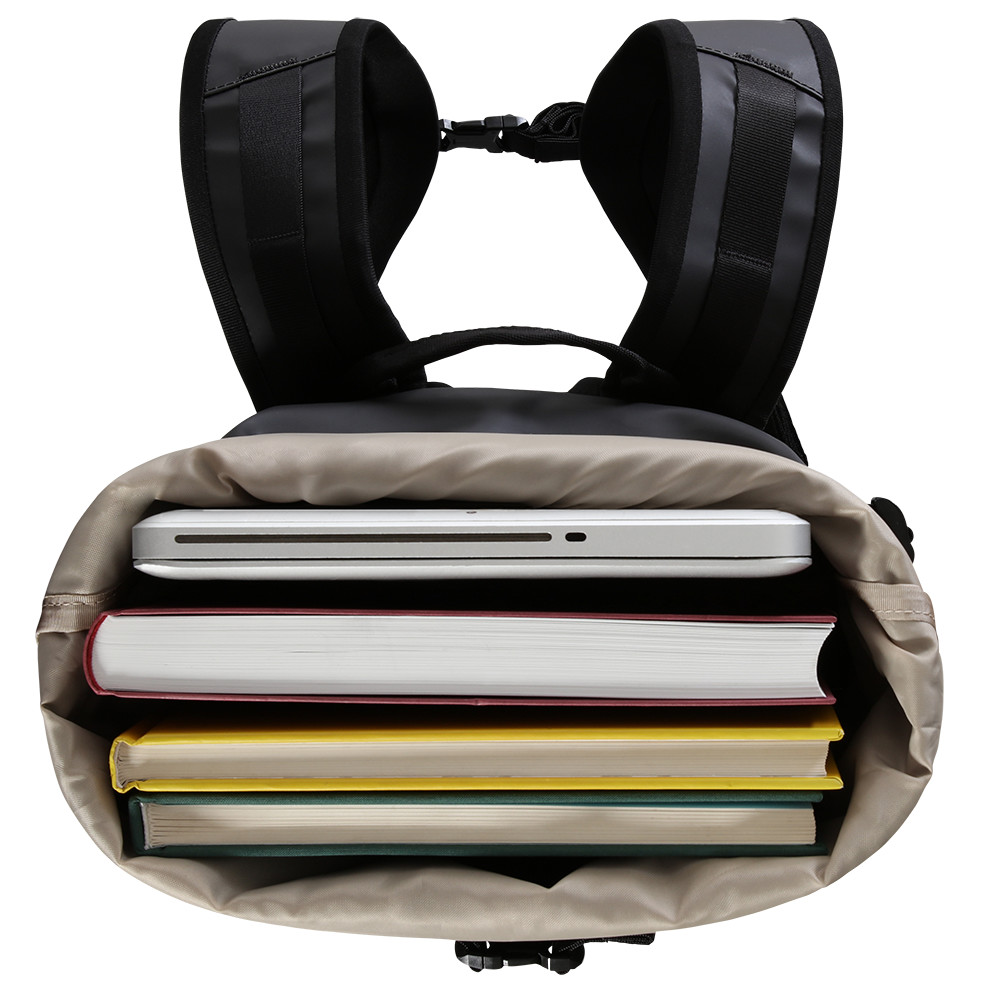 Městský batoh s rolovacím víkem, vyrobený z voděodolného materiálu. Má velkou kapsu na notebook, dvě postranní kapsy na láhev s vodou a polstrovaná záda a ramenní popruhy z měkké pěny.