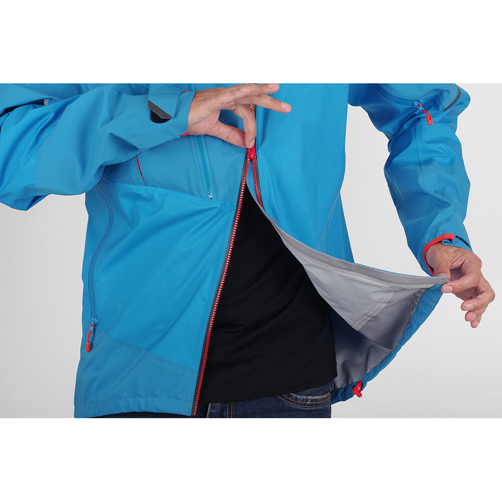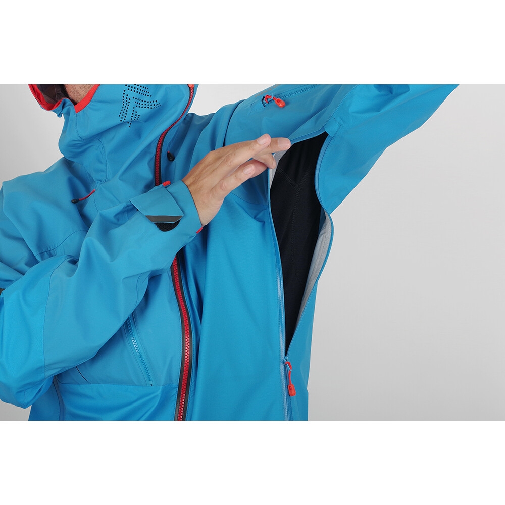Novinkou je nejtenčí 3-vrstvý membránový materiál Pertex. Vrchní materiál je 100% recyklovaný, přináší vyšší odolnost, lehkost a ekologickou udržitelnost. Pevná a odolná kapuce s více směrným regulováním umožňuje přetažení přes přilbu. Zvýšený přední díl límce ochrání obličej před nepříjemným větrem a asymetrický centrální zip nezasahuje do obličeje. Mechanickému poškození zabrání zesílení odolnější tkaninou ve všech namáhaných partiích jako ramena, rukávy, kapuce a zadní díl. Odvětrávací otvory v bocích jsou snadno dostupné i s batohem, zipy jsou protažené do přední části pro dostupnost kapes spodních vrstev.
