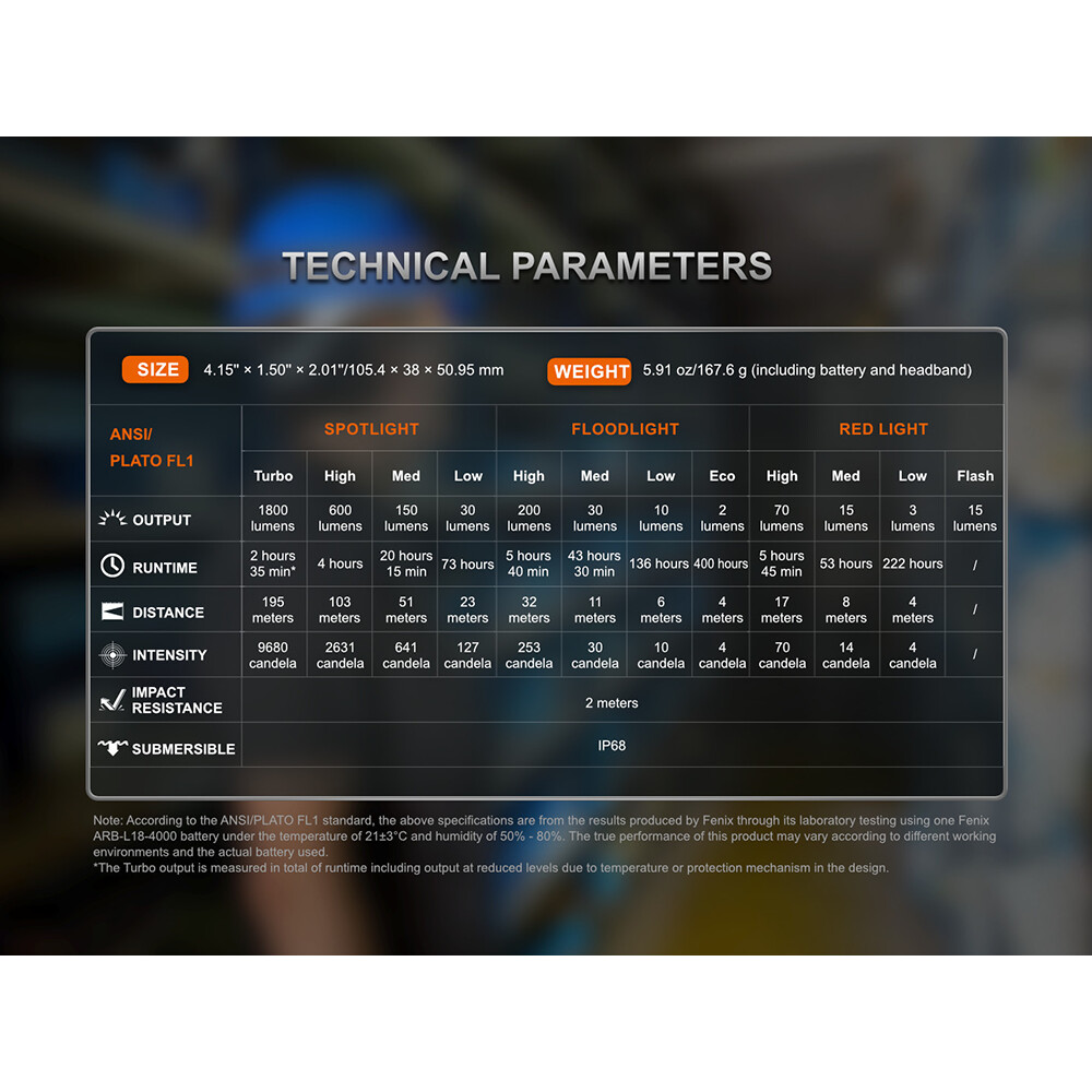 - všechny parametry svítilny (světelný tok, doba provozu na baterie, vodotěsnost, dosvit a nárazuvzdornost) jsou změřeny v souladu s normou ANSI/PLATO FL1.