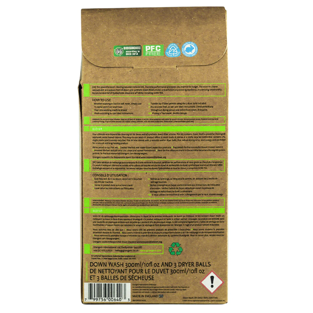 Tekutý prací přípravek Down Wash Kit značky Grangers šetrně odstraní nečistoty a zápach při zachování nepromokavosti a prodyšnosti materiálu. Tři kusy vlněných míčků do sušičky, zabrání shlukování peří při sušení. Díky tomu bude perfektně "načechrané" a vaše vybavení získá znovu na objemu.