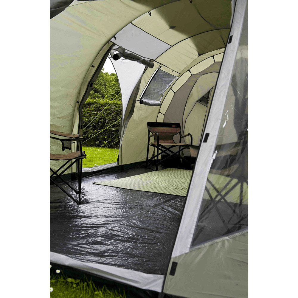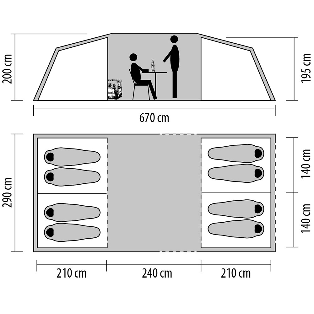 ...tedy přesněji 8 osob se zde pohodlně vyspí, posedí, nají, poklábosí, ať už je pěkně nebo škaredo. Tento stan splňuje naprosto vaše představy o pohodlí na vaší dovolené a nebo pokud chystáte zahradní party. Tunelový nadstandardně dimenzovaný stan, který je nejen snadný na stavbu, ale i nabízí velkou variabilitu vnitřního prostoru. Čtyři dvoumístné ložnice lze na každé straně propojit a tak můžou lehce vzniknout 1-2 čtyřmístné ložnice. Stan ale můžete použít i bez zmiňovaných ložnic a tak máte v tu ránu připravený párty stan. V celé ploše je všitá podlážka, a tím je zaručena čistota vnitřního stanu.