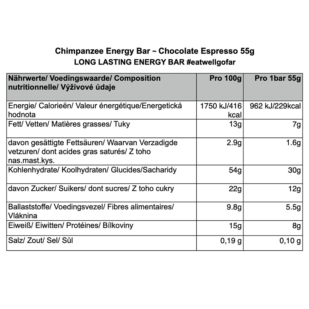 Kvalitní zdroj energie potřebný, jak v běžném životě, tak především při sportu. CHIMPANZEE Energy Bar je chutným a vhodným zdrojem energie pro všechny druhy aktivit. Zastoupení základních živin (sacharidy 27 g, bílkoviny 9 g, tuky 7 g, vláknina 6 g) je v ideálním poměru pro potřeby organismu při fyzické aktivitě. Z největší části je tvořena sacharidy, které ve výživě člověka představují nejvýhodnější energetický zdroj.