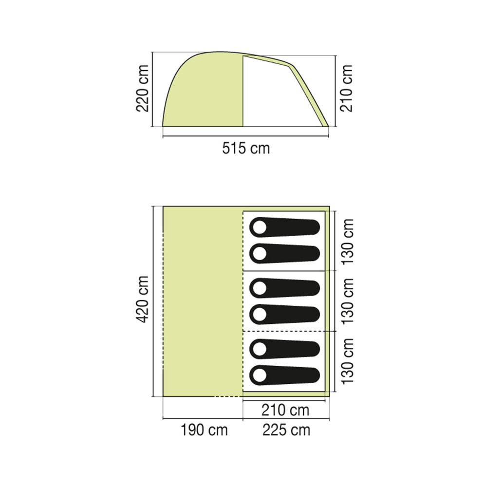 Prostorný rodinný stan pro šest osob. Má tři samostatné ložnice, dva vchody a dvě velká okna s možností zastínění. Vnitřní výška 200 cm pro pohodlné postavení dospělé osoby. Jednoduchá stavba.