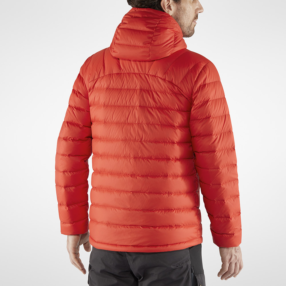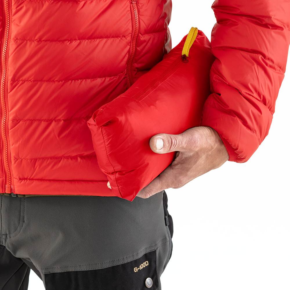 Lehká, všestranně využitelná a skladná péřová bunda Fjällräven vhodná do zimního počasí. Má prošívanou výplň z eticky získávaného peří a syntetickou izolaci na ramenou.