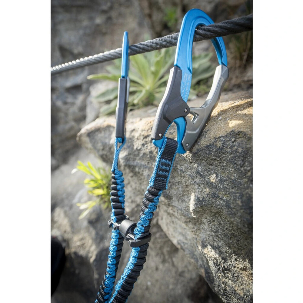 Špičková ferratová brzda Edelrid vybavena velkými a ergonomickými karabinami s dlaňovou pojistkou, obrtlíkem a kompaktním tlumičem rázové síly.