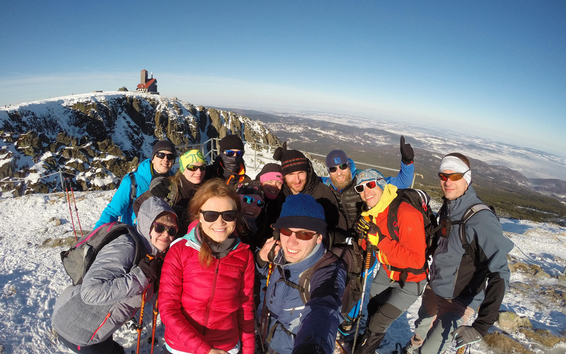 V praktické dopolední části se všichni konečně dostali k upnutí sněžnic a aktivitám v okolí boudy. Po obědě se určil východní směr a vyrazilo se za západem slunce. Naplánovaná trasa odpoledního výletu vedla z Brádlerových bud přes Ptačí kámen na chatu Vatra a dále přes rekonstruovanou Petrovu boudu na hřebeny, kde se přes genderově neutrální území Dívčích a Mužských kamenů dostaneme až na křižovatku zvanou Pod Smělcem. Odtud už jen pár set metrů a jsme zpátky na boudě. Trasu s nastoupanými 380 výškovými metry, dlouhou 9 kilometrů, zvládla skupina v mírném tempu s četnými přestávkami na focení za 3 hodiny a rozhodně bychom jí vřele doporučili všem, kdo si na Brádlerce sněžnice zapůjčí a poprvé na nich vyrazí za krásami vůkol. Návrat za tmy s třpytem nad našimi hlavami jen potvrdil, že krása je tu skutečně na každém rohu, stačí ji vidět. Komu zbyly síly, vyrazil na tři kola finské sauny. Komu i po ní, pokračoval ve finském stylu na baru.