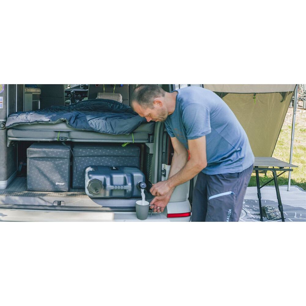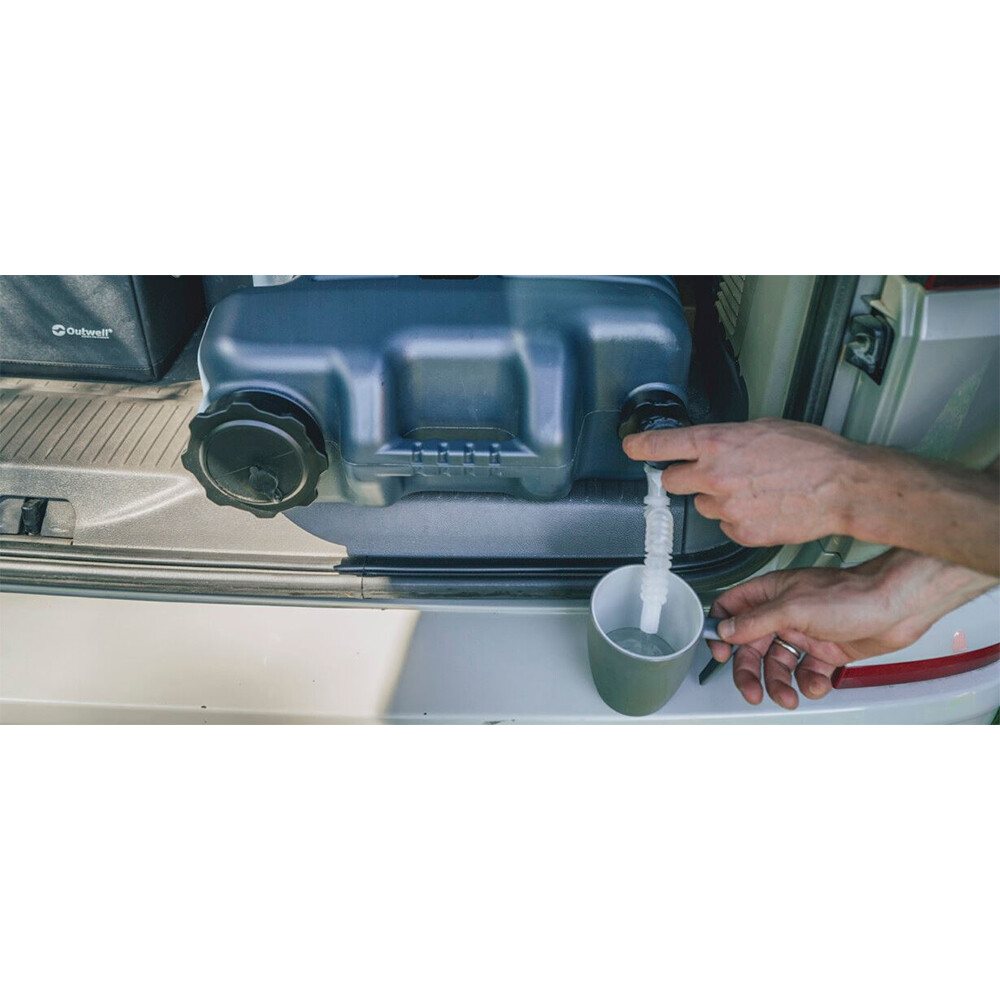 Nádoba na vodu od značky Outwell je z pevného materiálu a nabízí více možností použití. Kanystr má dva otvory různé velikosti, opatřené šroubovacím uzávěrem. Oba můžete využít pro plnění i nalévání. Pro snadnější použití je součástí také nalévací hadička, se kterou si pohodlně natočíte vodu do hrnku nebo lahve s úzkým hrdlem. Kanystr lze používat v horizontální i vertikální poloze. Má také dvě držadla (na horní a boční straně), aby se snadno přenášel i při úplném naplnění. Je ideálním doplňkem při cestování autem nebo při kempování větší skupiny osob.