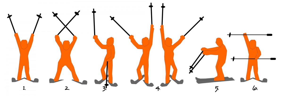 - Obě hole nahoru ve tvaru písmene Y: „Jeď v blízkosti mé stopy, v koridoru!“