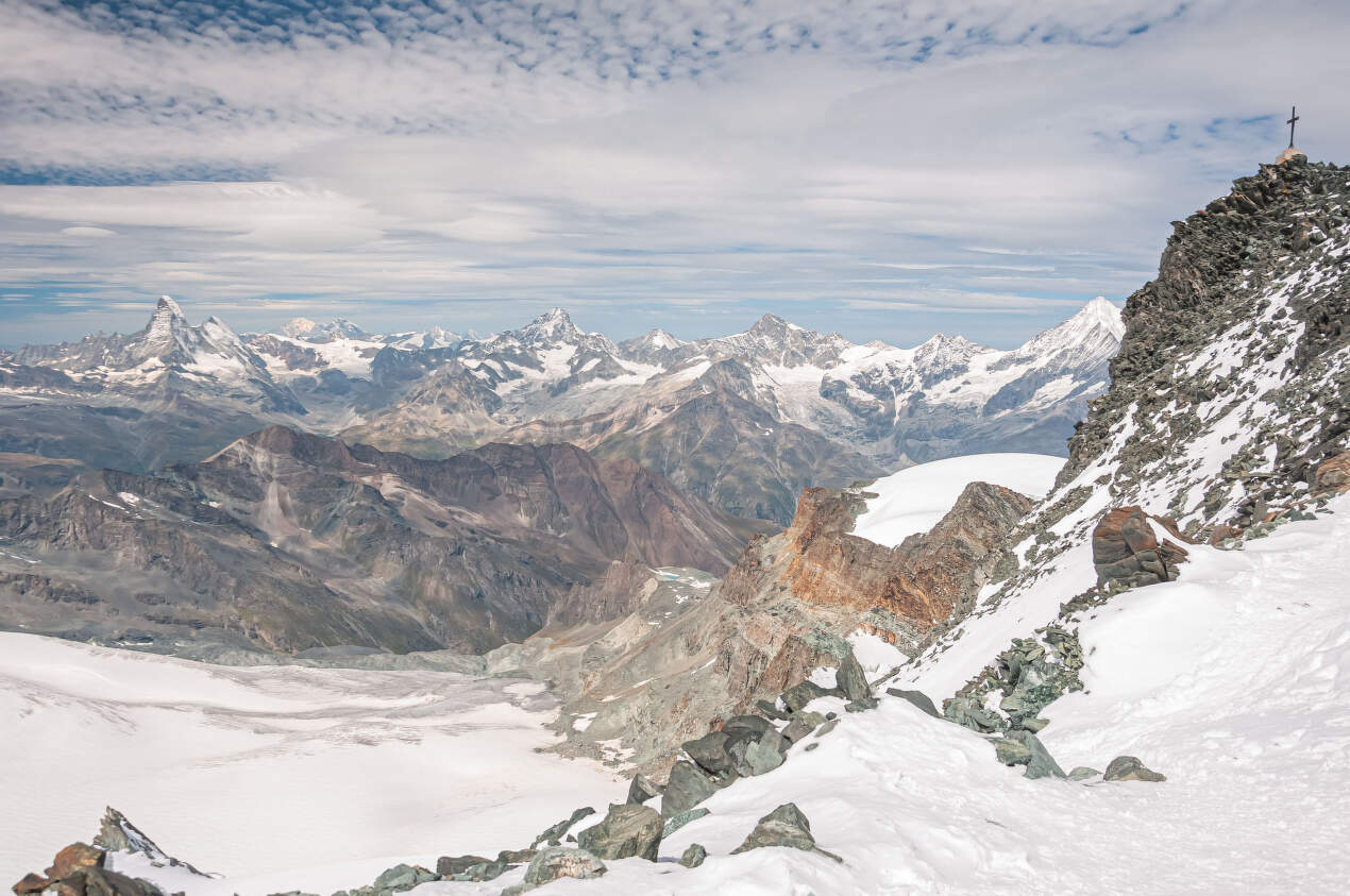 Rychlé vrcholové foto a raději se přesuneme o pár metrů níž, do závětří. Teprve tady vytahujeme svačinu a v klidu si dopřáváme zasloužený odpočinek s výhledem na okolní velikány. Ne všechny dokážeme pojmenovat, některé dominanty však s jistotou určíme. Na svahu Strahlhornu sledujeme dvě lanová družstva pomalu stoupající po ledovci. Za nimi se zvedá masiv Monte Rosy. Naproti nám se ostře rýsuje Matterhorn a v dálce, jako bílý přízrak, vystupuje Mont Blanc.