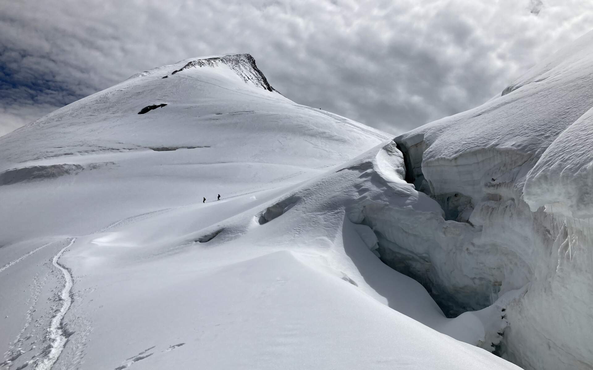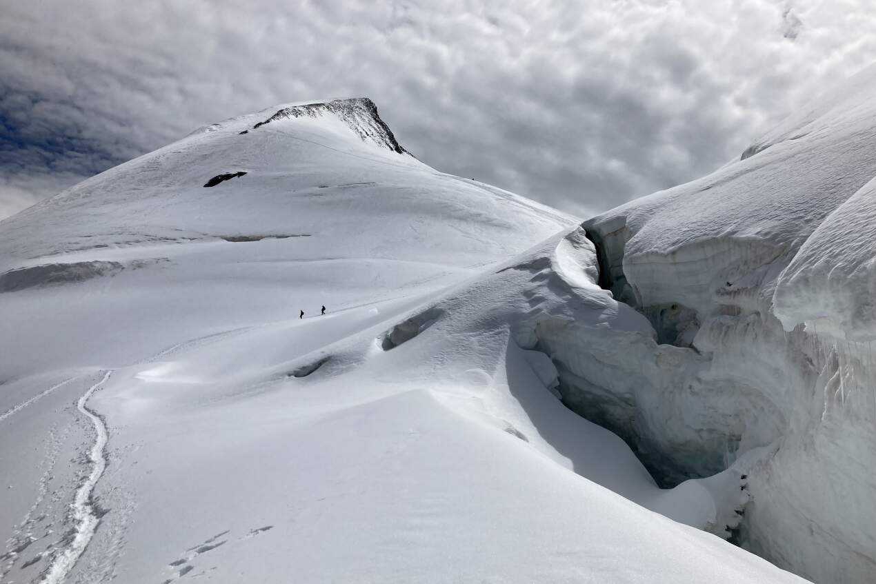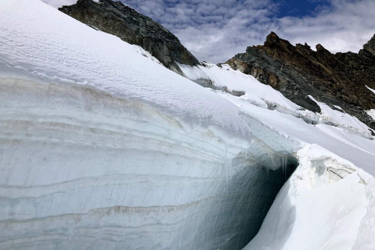 Najednou jsme se ocitli ve světě, kde vzduch voní sněhem. Z konečné stanice vystupujeme společně s několika lyžaři, kteří si přijeli užít letní lyžovačku na ledovci Feegletscher. Zasněžený kužel Allalinhornu máme od prvního okamžiku na očích, takže cíl je jasný. Navlečeme se do sedáků, nazujeme mačky a vyrážíme vstříc novým zážitkům. Jakmile přeběhneme přes sjezdovky křižující naši cestu, navážeme se na lano a začneme pomalu stoupat.