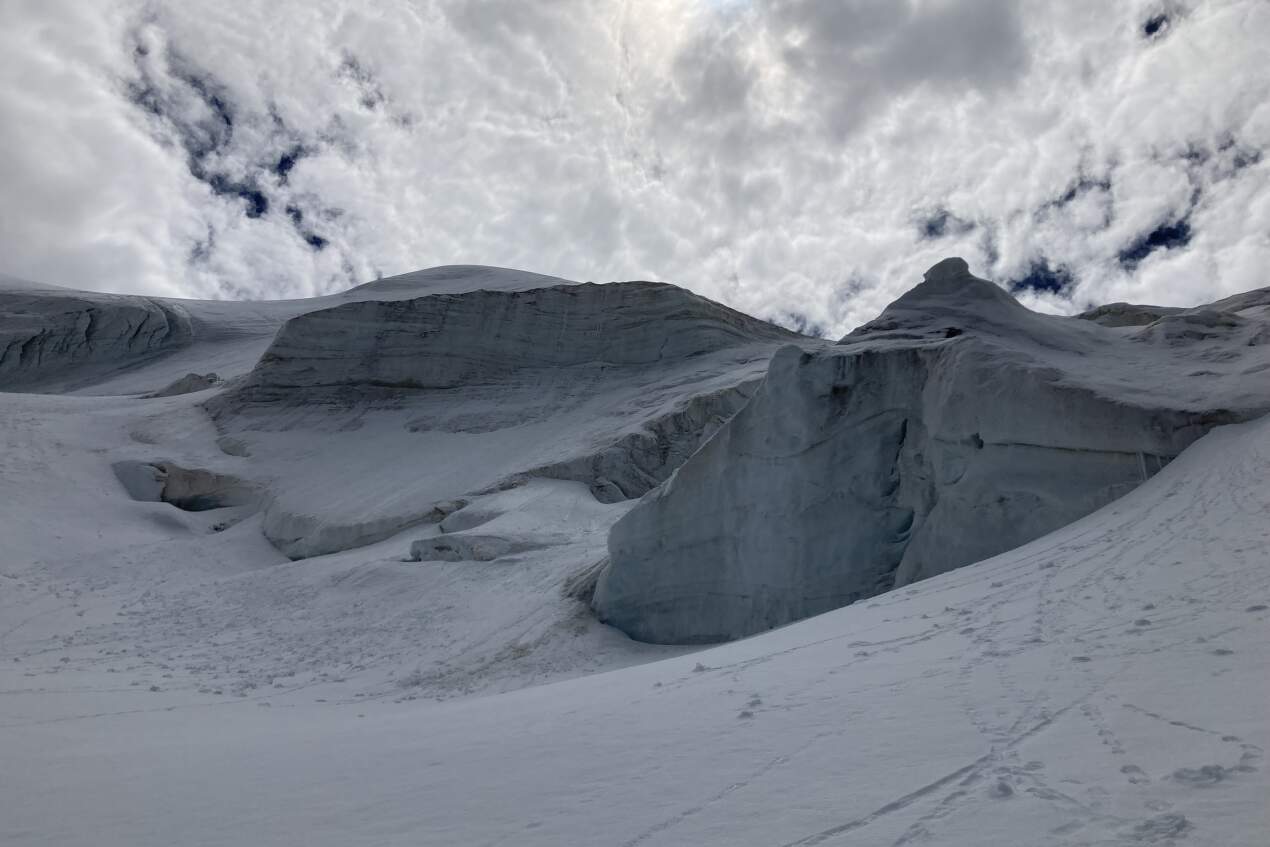 Slunce pomalu začínají zahalovat mraky, takže velím k sestupu. Cesta zpátky jde o poznání lépe. U obří trhliny se na chvíli zastavíme a prohodíme pár slov s místním průvodcem. Ráz počasí se začíná rychle měnit. Sníh odtává pod nohama a svah nad námi se mění v potenciální lavinové pole. Přidáme trochu do kroku, abychom byli co nejrychleji dole. Konečně jsme v bezpečí lyžařského areálu, který tou dobou již zeje prázdnotou. Chůze v rozbředlém sněhu je namáhavá a nekonečná. Zpět k Mittelallalinu přicházíme kolem půl jedné. Jsme příjemně unavení, ale šťastní a náležitě hrdí.