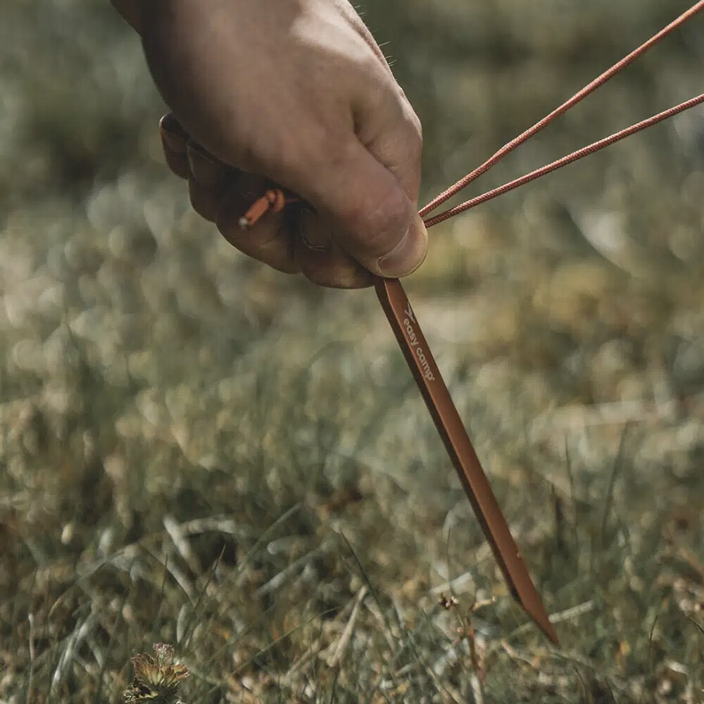 Stanové kolíky značky Easy Camp Aluminium V-Pegs jsou navrženy tak, aby spolehlivě ukotvily stan, tarp nebo přístřešek i v pevné, kamenité či smíšené půdě. Díky V-tvaru a plochému profilu poskytují lepší úchop v zemi než standardní kulaté kolíky a zvyšují stabilitu ukotvení. Kolíky jsou vyrobeny z odolného hliníku 6061, což zajišťuje nízkou hmotnost a zároveň dostatečnou pevnost při opakovaném používání. Oranžová barva zvyšuje jejich viditelnost v trávě nebo zemi a praktická smyčka na vrcholu usnadňuje jejich vytažení při balení.