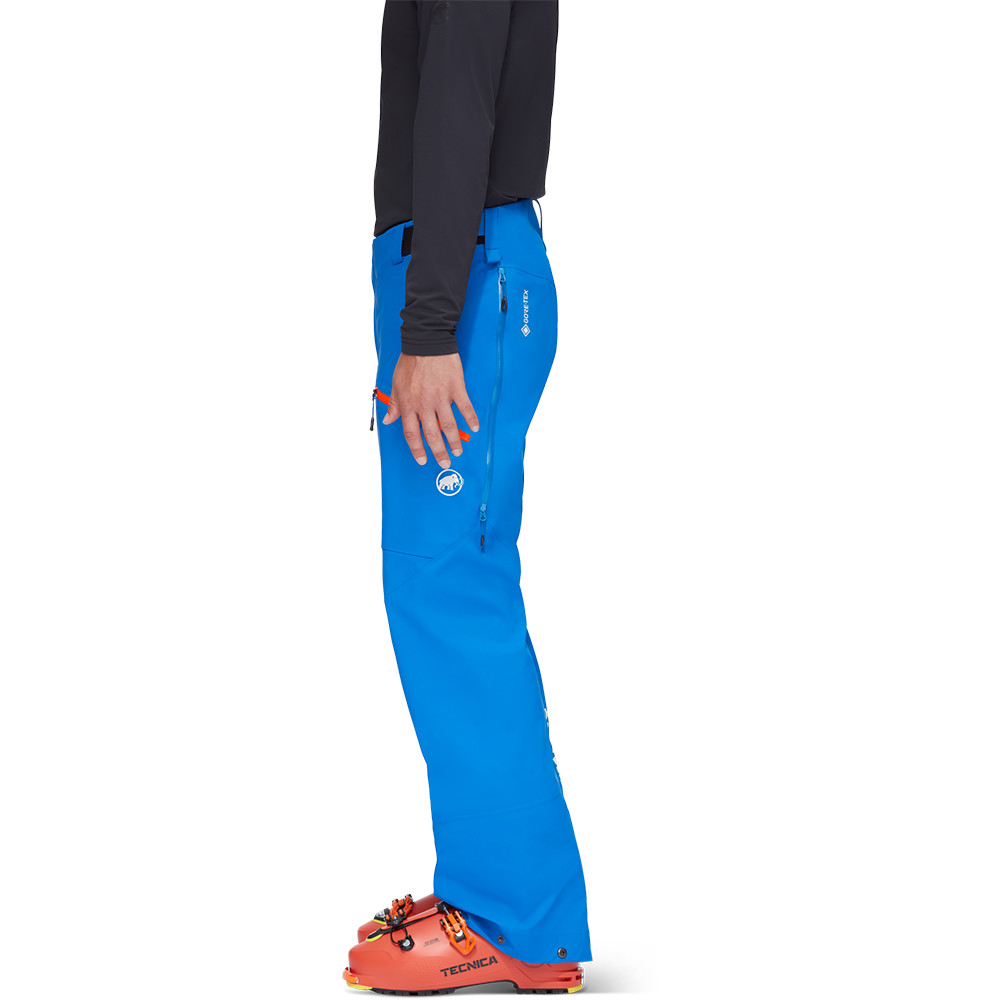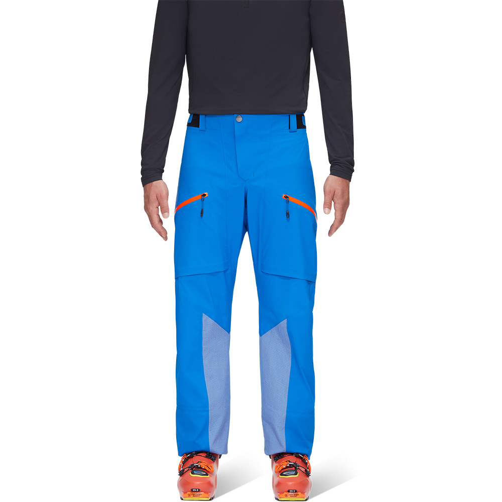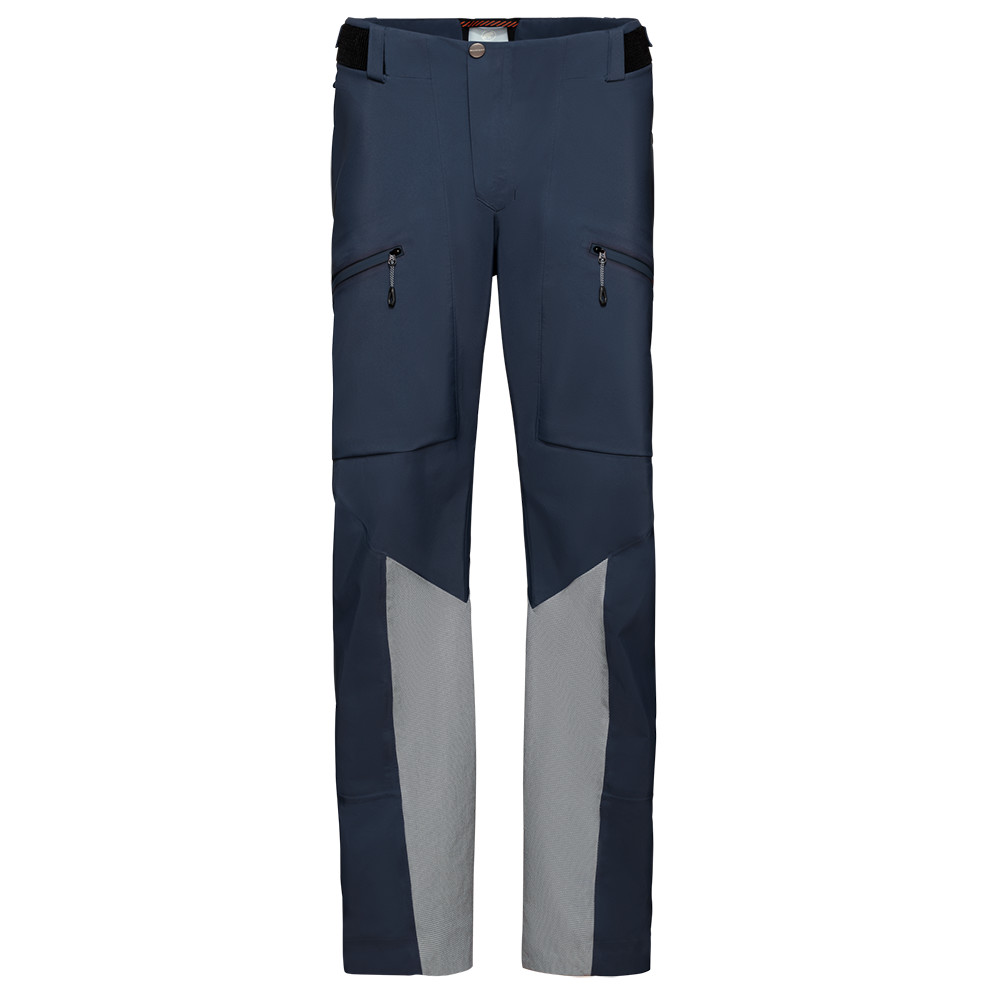 Pánské technické svrchní kalhoty od firmy Mammut vás ochrání při nepřízni počasí. Kalhoty jsou nepromokavé, prodyšné, větruodolné. Sportovní střih poskytne volnost pohybu. Kalhoty mají zipové větrání, zipové kapsy, integrovanou kapsu na telefon, nastavitelnou šířku nohavic, zesílené nohavice a protisněhové manžety.