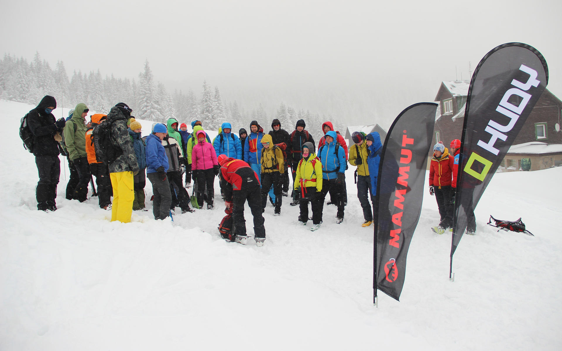 Patek 13. - datum ideální k zahájení lavinového kurzu pod taktovkou značky Mammut ve sněhem utopených Krkonoších. Slunce už dávno zapadlo nad Vysokým kolem, když se 27 účastníků schází v jídelně na Brádlerových boudách. Slovo si bere legendární horský vůdce a odborník na lavinovou problematiku Dušan Stuchlík a lavinový kurz muže začít. Páteční večer je věnován úvodu do problematiky lavinové bezpečnosti, specifiku lavin v Krkonoších a v neposlední řadě je představen HUDY lavinový tým.