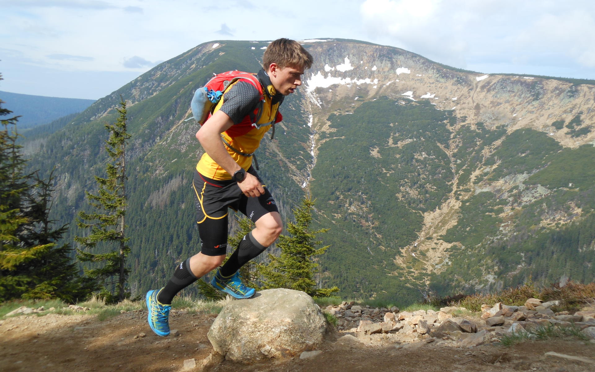 Já, spolu s kamarádem Míšou Veselým, pro změnu svadím boj s trailovými batůžky, do kterých se pokouším narvat vše potřebné. Zadaří se a my konečně můžeme vyběhnout. Dynamické stoupaní okolo Trkače nás rychle probere a zároveň připomene včerejší dlouhé "ponocování". Na vrcholu Sněžky nezbytné "selfí" a konečně svižně sbíháme po hřebeni směr Pomezní boudy. Z Pomezek je to kousek do rozkvetlých Rýchor.