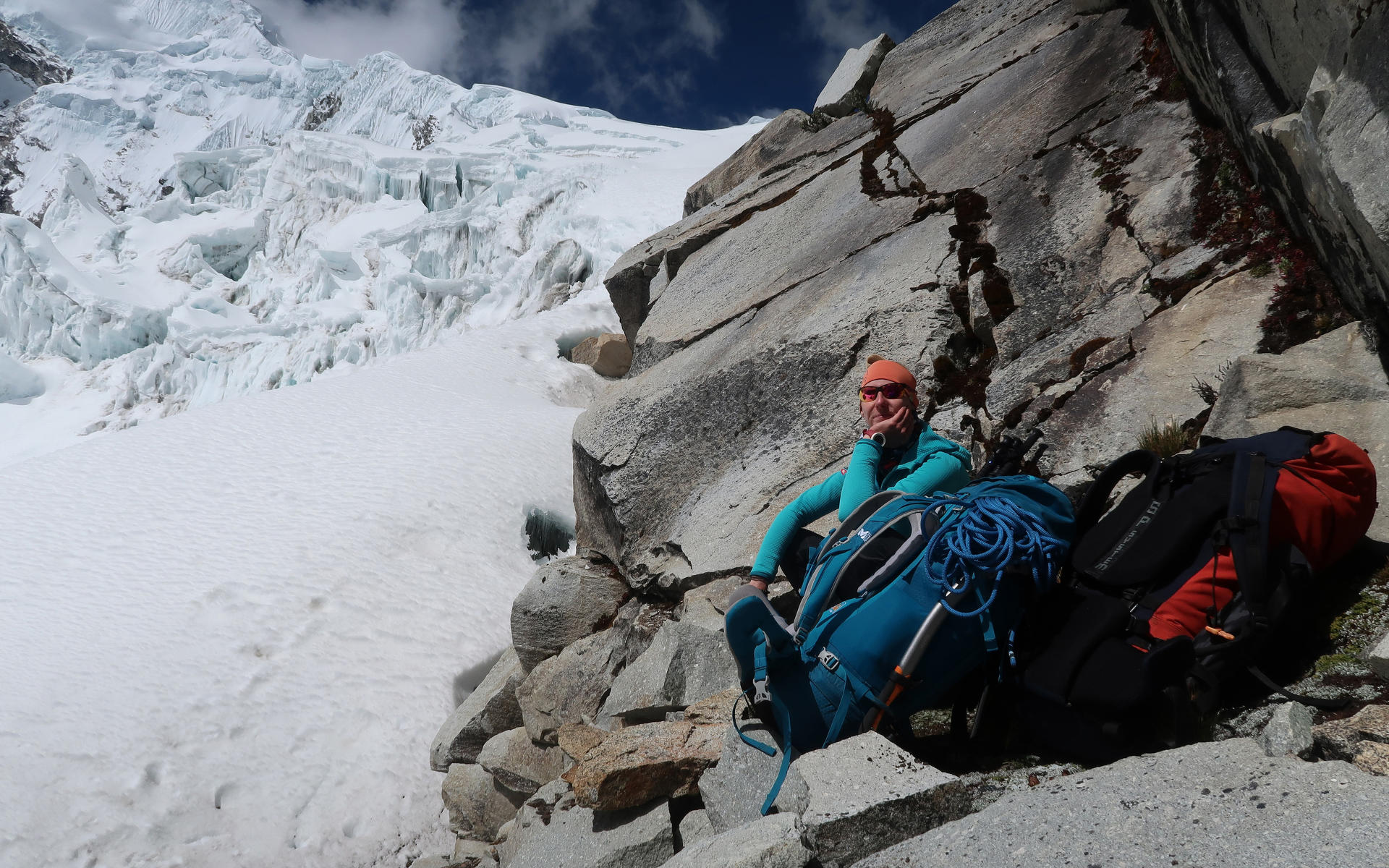 Slávek doporučené výstupy prostudoval v průvodci od Brada Johnsona Classic Climbs of Cordillera Blanca z roku 2009. V něm má nejlepší hodnocení Chopicalqui. Počkali jsme na zlepšení počasí a šest dní před odletem ještě spěšně vyrazili do hor. Tentokrát jsme šli nalehko a tím pádem rychle. Druhý den jsme už stáli v prvním výškovém táboře. Zbývaly dva dny na výstup na vrchol. Bohužel ani jednu ze dvou nocí nad 5000 m jsem nespala. Hrozné pálení na plicích a bublavý kašel mi naháněli strach. Přesto jsme se vydali k ledovci s cílem postavit další tábor v 5600 m, rychle navařit, zalehnout a brzo ráno zkusit vršek. Jenže přechod ze sutě na ledovec tvořila šílená změť trhlin a séraků. Nikde jsme navíc nenašli ani náznak po předchozích stopách, které by nás bludištěm provedli. Jak se mi ulevilo, když Slávek prohlásil: „Jsme pomalí, tohle už nedáme“. Na vrchol zbývalo tisíc výškových metrů a bylo jasné, že za dva dny i s návratem do Huarázu to nestihneme.