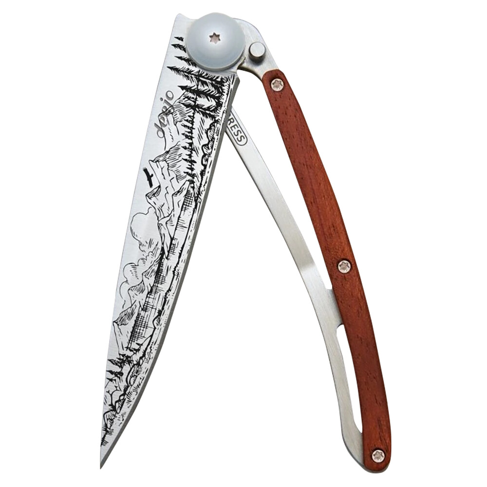 Značka Deejo vznikla z touhy oživit potěšení z vlastnictví kapesního nože. Originální, laserem tepaný, vzor hor na čepeli, povyšuje nůž na osobní doplněk nebo vyjímečný dárek. Navíc vždy z ušlechtilých materiálů, s bezpečnostní pojistkou a sponou na opasek. Střenka z exotického dřeva coralwood vyniká svým elegantním načervenalým odstínem. Dřevo z exotického stromu původem z Indie, je přirozeně žluté barvy, ale získává svůj červený nádech působením světla.