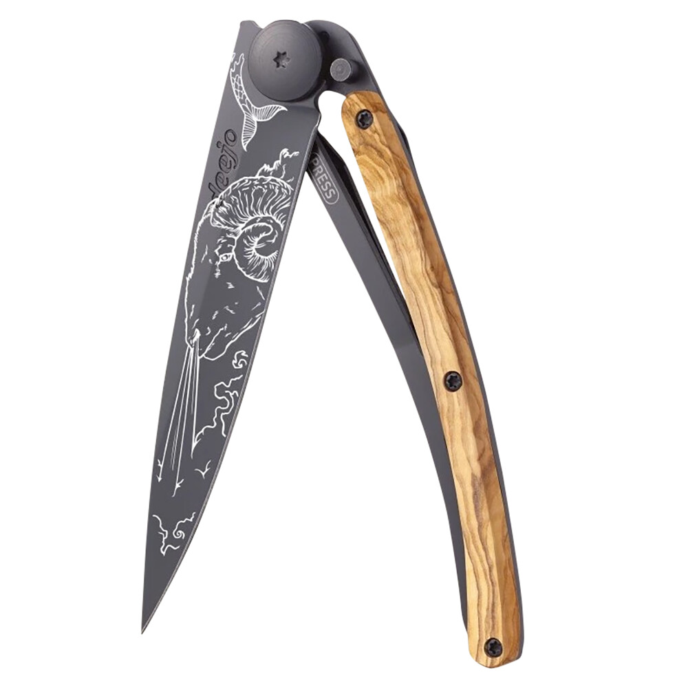 Značka Deejo vznikla z touhy oživit potěšení z vlastnictví kapesního nože. Originální, laserem tepaný, vzor se znamením zvěrokruhu kozoroha na čepeli, povyšuje nůž na osobní doplněk nebo vyjímečný dárek. Navíc vždy z ušlechtilých materiálů, s bezpečnostní pojistkou a sponou na opasek. Střenka z olivového dřeva vás zaujme atraktivní kresbou. Pomalu rostoucí dřevo olivovníků je tvrdé a pevné. Každý jeho kousek je originál.