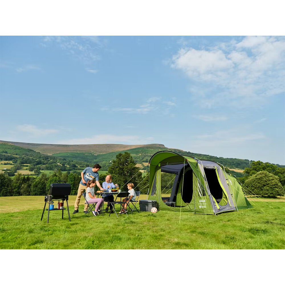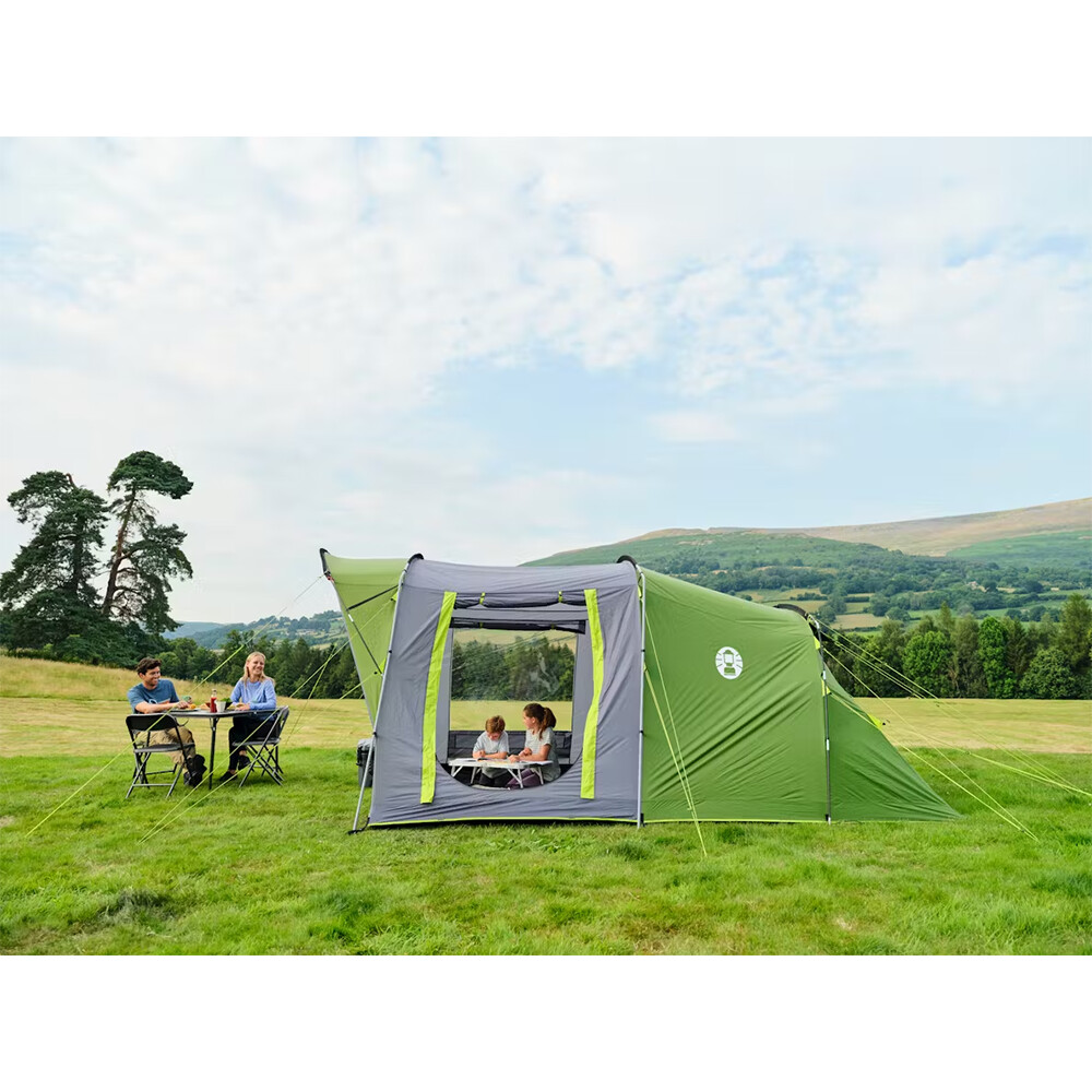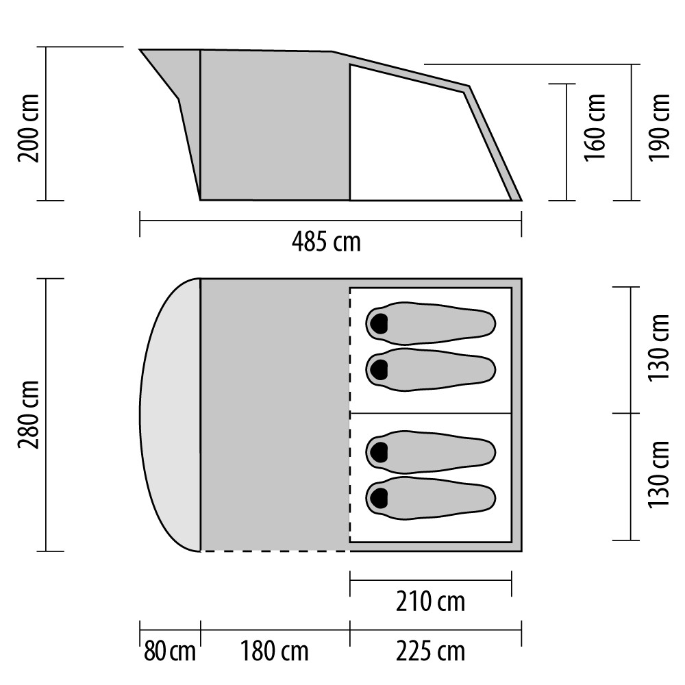 Velký stan až pro pět osob, s prostornou předsíní a jednou ložnicí. Má dvě velká okna, možnost využití vchodu jako markýzy. Uvnitř najdete kapsy na drobností a otvory pro tažení el. kabelů mimo vchod.