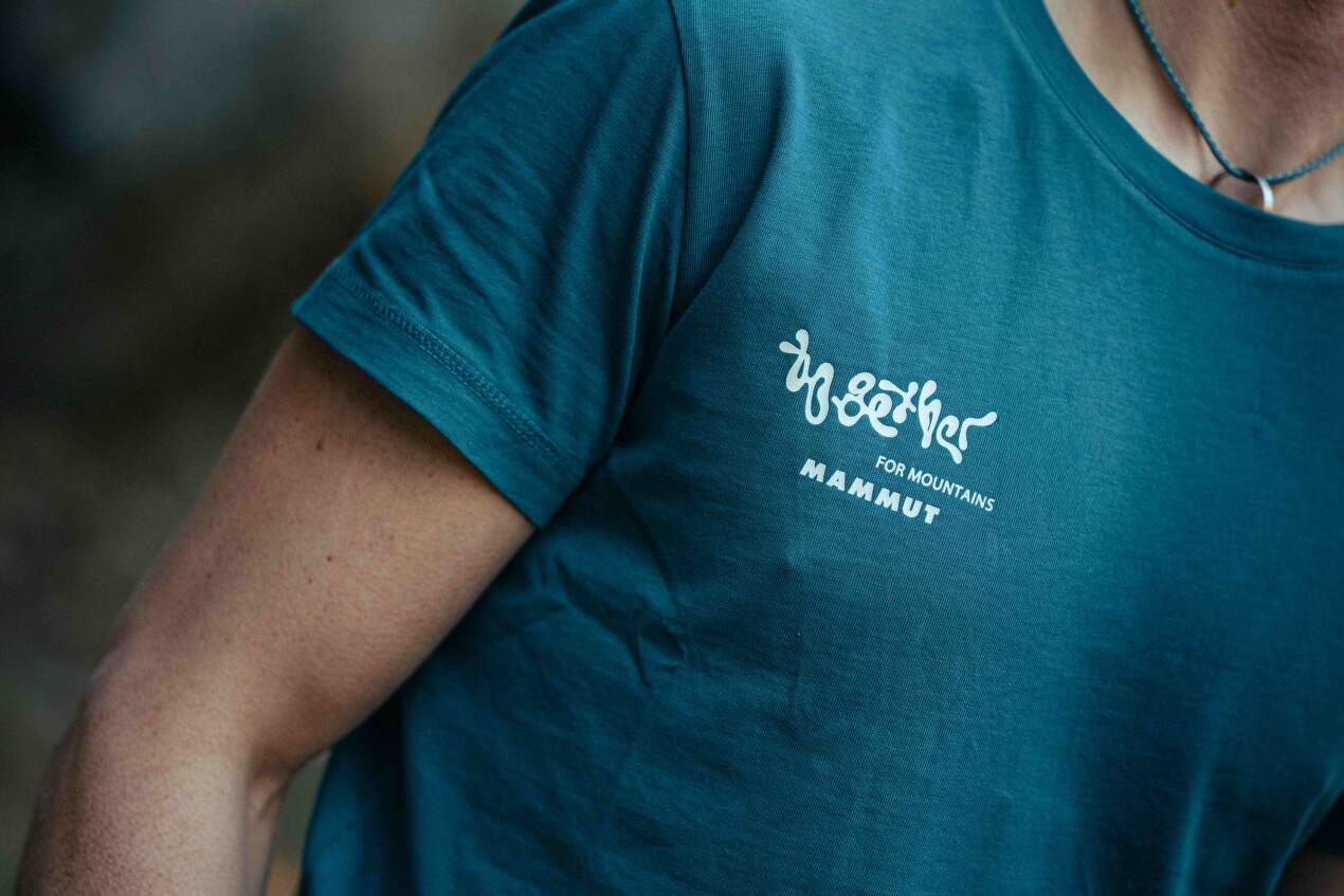 Styl triku dodává drobný potisk vpředu na pravém pleci, který zezadu pokrývá celá horní záda. Nápis „Together“ („společně“) je ostatně v samotném názvu trika. Pospolitost takového nápisu odkazuje na způsob, jakým lezci inspirují jeden druhého, potkávají se pod skalami a stěnami a pomáhají si při překonávání nejrůznějších výzev. Firma Mammut se tak zároveň snaží vyzývat a inspirovat ke sjednocení všech outdoorových nadšenců – a nejen jich – při nalézání stále nových cest, jak snížit naše negativní vlivy na životní prostředí, tedy prostředí, v němž se odehrávají naše nejkrásnější chvíle.