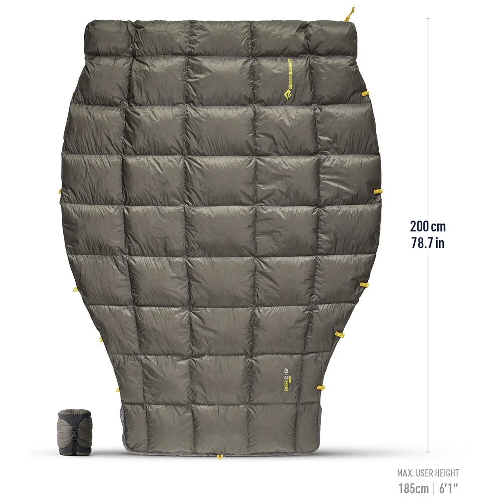 Přikrývka typu quilt, tedy spacák bez zipu, kapuce a bez spodní izolační části, je ideální jako lehká varianta pro spaní ve stanu, žďáráku, v hamace nebo při cestování autem. Izolaci tvoří kachní peří s úpravou proti vlhkosti. Model Ember Quilt od značky Sea to Summit má navíc zacvakávací přezky (QuiltLock) díky kterým ho můžete připnout ke spacáku a výrazně tak zvýšit jeho tepelný komfort. Doporučené teplotní rozmezí je 7 až 11°C.