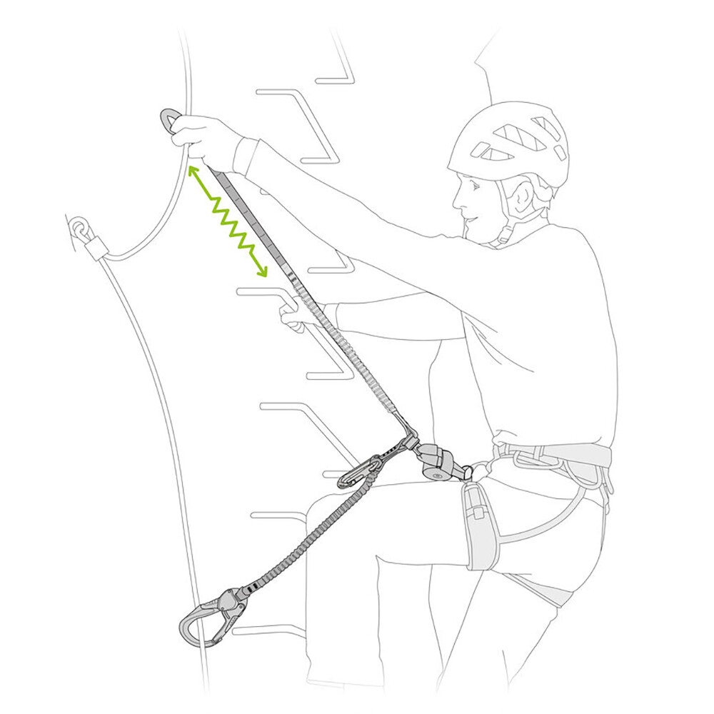 Otočný závěs zabraňuje zamotávání smyček při postupu. Karabiny EASHOOK se snadno používají a poskytují vynikající úchop. Zámek karabiny je opatřen automatickou pojistkou, která se okamžitě odemkne, pokud karabinu uchopíme do dlaně. Karabiny mají velkou světlost západky, takže je můžete snadno a rychle připojovat a odpojovat ze zajišťovacích ocelových lan. Tlumič je opatřen třetí krátkou smyčkou, na kterou můžete instalovat karabinu (není součástí setu) a používat ji jako odsedávací smyčku nakrátko např. pro odpočinek na příčkách ferratových žebříků.