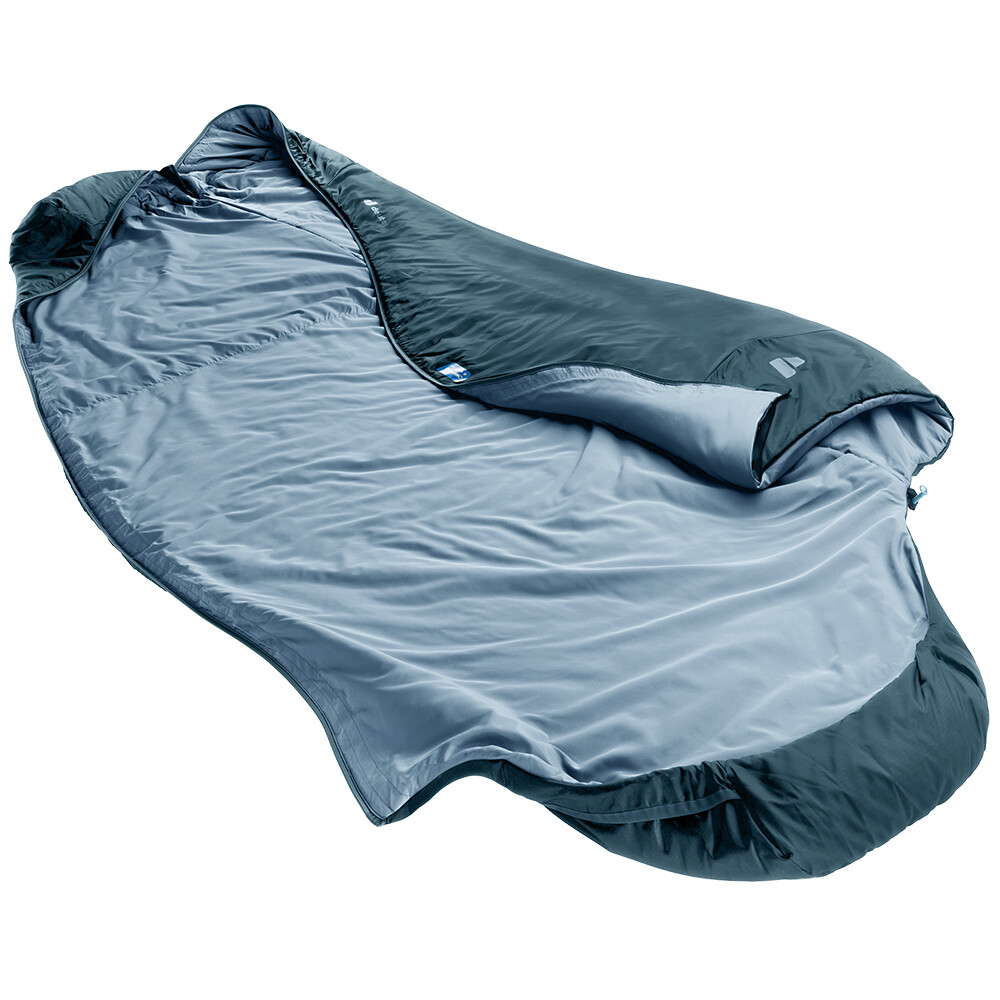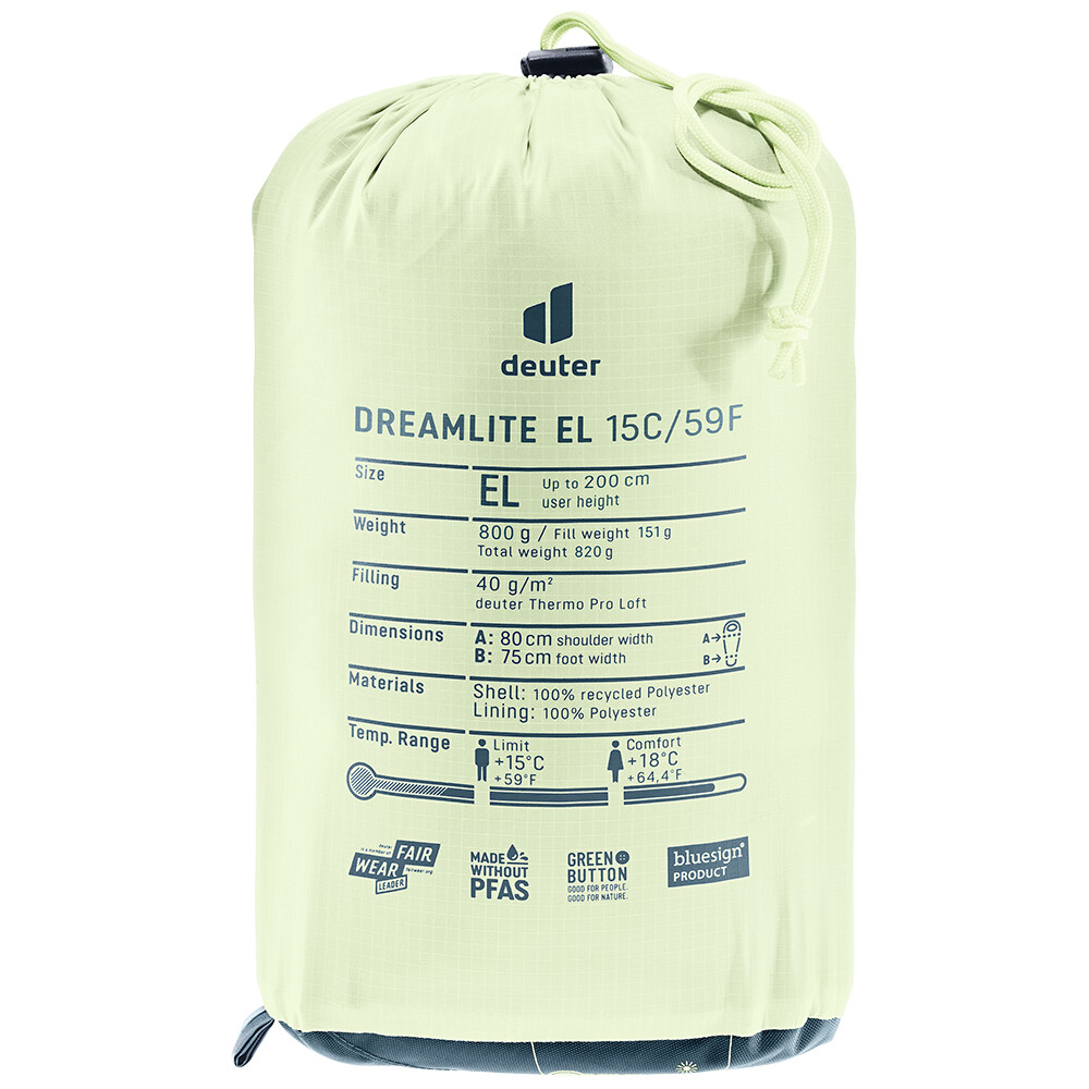 DreamLite EL 15 je spací pytel od značky deuter určený pro letní dobrodružství. Má nízkou hmotnost a malou velikost po sbalení do obalu. Je celorozepínací, takže ho můžete využít také jako přikrývku. Jeho oválný tvar nabízí velkorysý prostor, který oceníte pokud se ve spánku více hýbete nebo rádi spíte na boku. Je vyrobený z recyklovaných materiálů a díky syntetické náplni se také snadno čistí a lze ho vyprat.