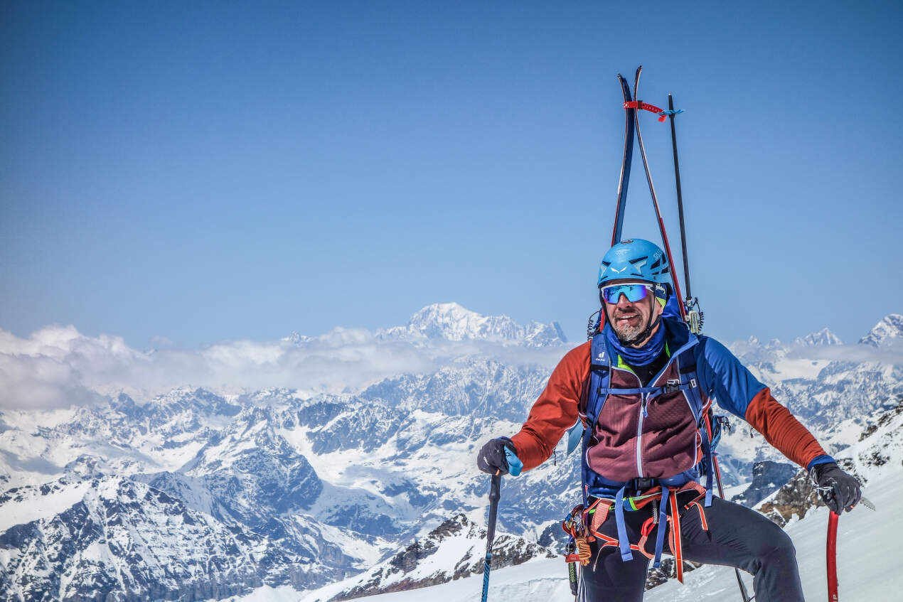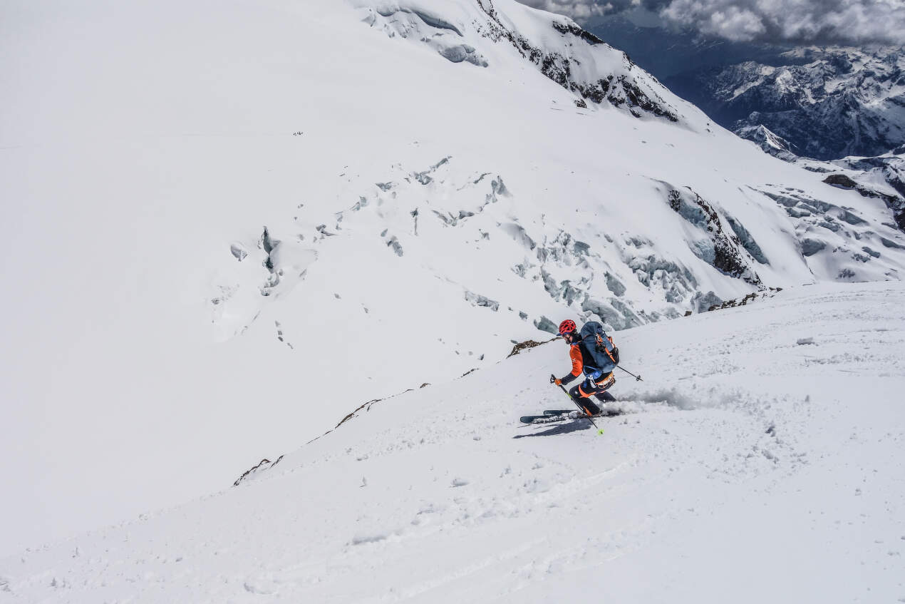 Na dokončení tohoto přechodu jsme s kluky čekali tři roky, nikdy nám nevyšlo počasí. Vždy se akce musela zrušit dříve, než vůbec začala. Protože na tuto variantu potřebujete opravdu dobré počasí. A teď jsme konečně tady! Poměrně dlouho vychutnáváme vrcholová panoramata a pak zahajujeme sérii tří slanění s lyžemi na zádech do sedla Silbersattel. Odtud ještě vystupujeme na Nordend (4609 m), což je opravdu poslední vrchol v masivu Monte Rosy. Je už dávno odpoledne a nám zbývá jediné: vychutnat si snadný, ale grandiózní sjezd s převýšením 1600 metrů po dramaticky vyhlížejícím ledovci až na poslední chatu na naší trase, kterou je Monte Rosa Hütte.