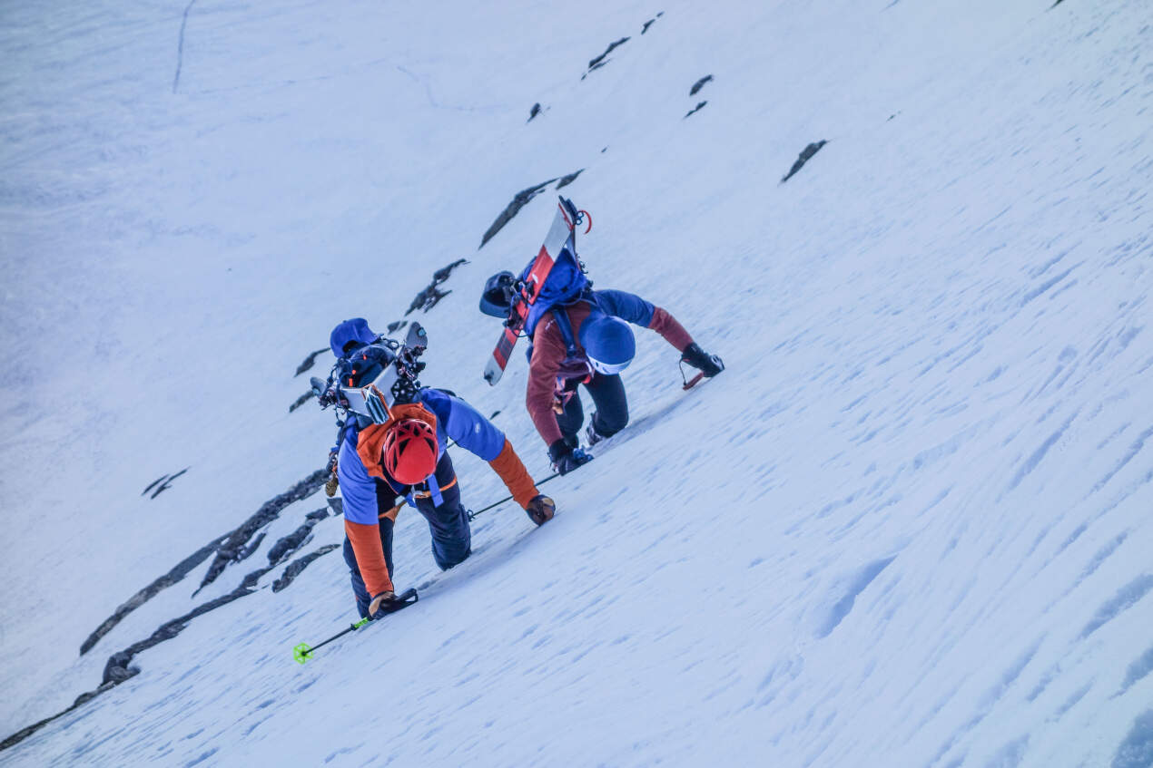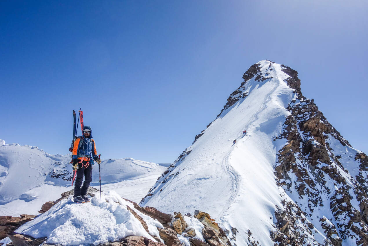A protože chladné počasí toho dne nám hraje do karet, rychle na lyžích traverzujeme k další čtyřtisícovce s krásnou sjezdovou linií, kterou je Pollux (4089 m) a jeho západní stěna se sklonem 46°. Normálkou podél řetězů lezeme s lyžemi na zádech nahoru a pohledem kontrolujeme stav sjezdové linie. Je zase v top stavu! Na vrcholu se nezdržujeme dlouho, pokračující měknutí sněhu a hromadění oblačnosti nás žene k vyššímu tempu.