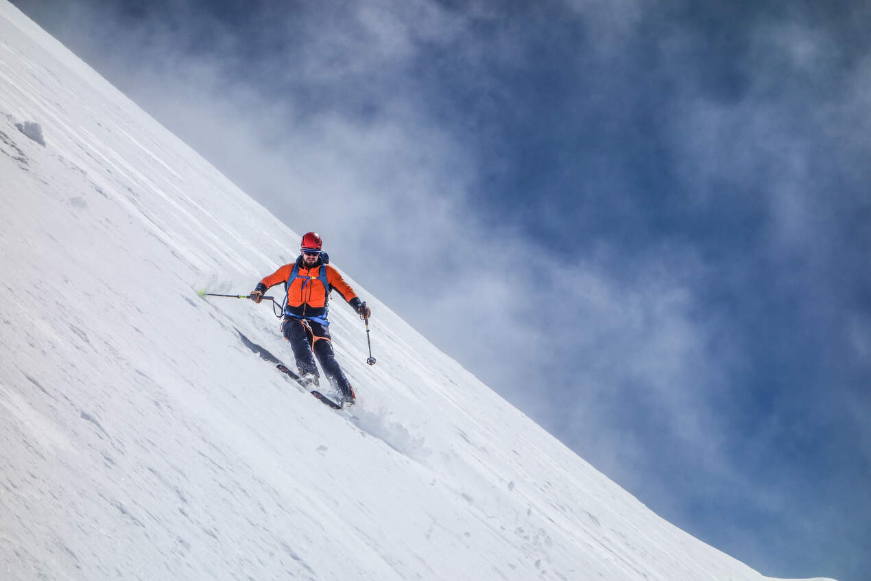 Následuje kratší den, kdy nemusíme příliš spěchat. V plánu máme jen přechod přes Castor (4228 m) a nocleh plánujeme na chatě Rifugio Quintino Sella. Klasickou stopou stoupáme na Castora a v závěru putují lyže na batoh. Ale známý ostrý sněhový hřebínek je takhle zjara naprosto snadný a ušlapaný do široké stopy. V hlavě počítáme spíše se sjezdem podél hřebene, tedy trasou klasického sestupu, ale o to větší je naše nadšení, když vidíme stav východní stěny, která nabízí parádní, přímou a lyžařsky mnohem atraktivnější sjezdovou linii směrem do Felikjochu.