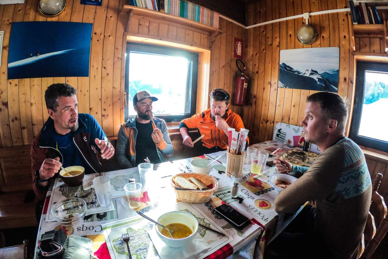 A pak už zase krájíme obloučky ve sklonu 46°, v maximálním soustředění. V hlavě nic jiného než tunelové vidění v přítomném okamžiku – ó, jak je to opojný pocit! První jede guide, aby odhalil případnou vrstvu ledu, po nalezení bezpečného místa k zastavení následují kluci v rozvážném, profesorském stylu. Lyžujeme trochu diagonálně, protože v čase krátce po poledni už spouštíme od lyží slušné sněhové splazy. V euforii pak sjíždíme až na místo našeho prvního noclehu, chatu Rifugio Guide Val d´Ayas.