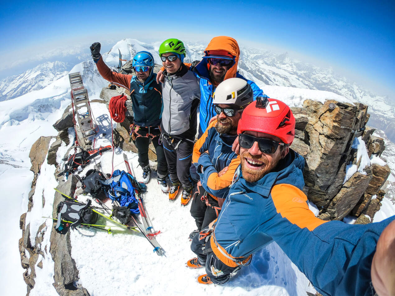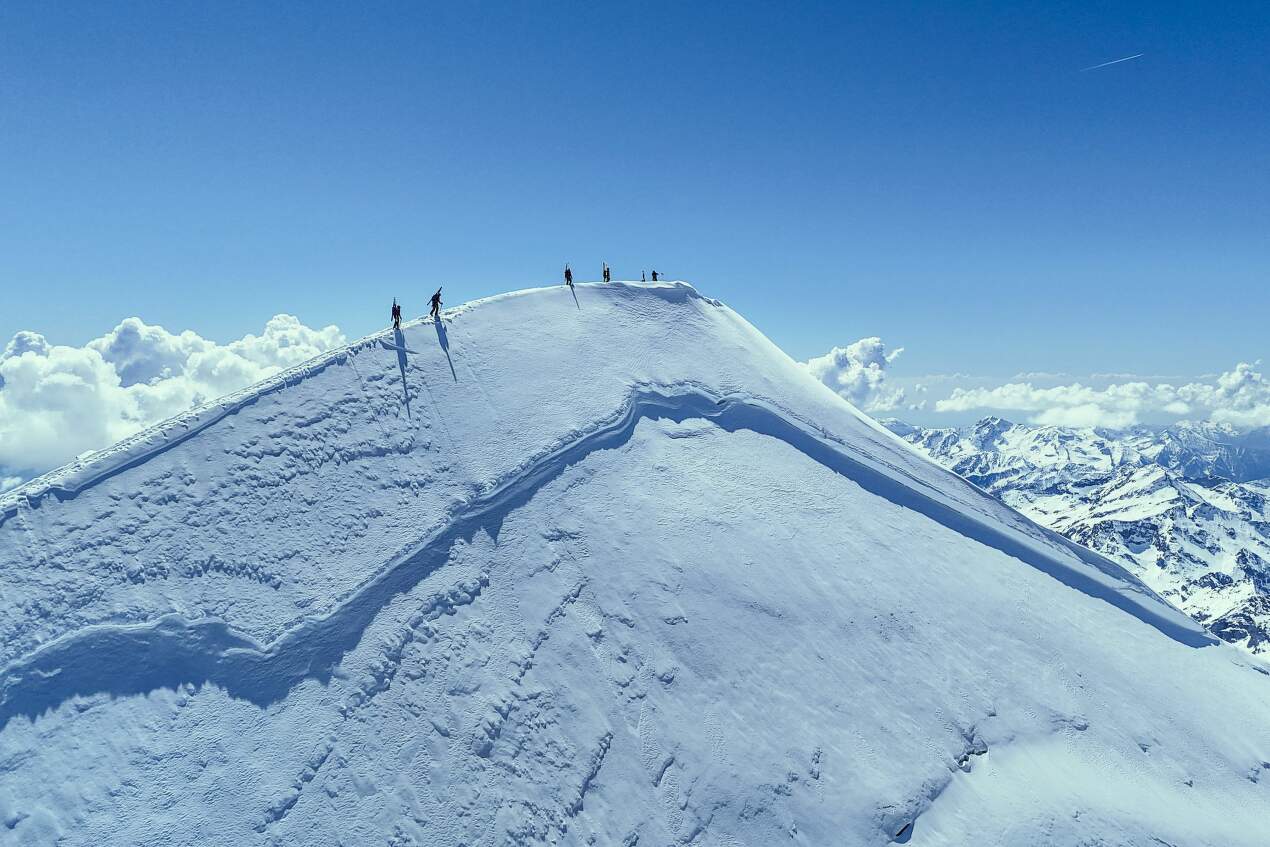 Touto variantou ale nikdo nechodí a je o ní jen minimum informací. Sázíme však na tuhle divokou kartu a cesta se ukazuje jako průchozí, v nejstrmějším místě se sklonem 50°. Brzy se napojujeme na normálku, kde je horda lidí. Navázaní na laně dolézáme okolo desáté hodiny na druhý nejvyšší bod Alp, kterým je Dufourspitze (4634 m). Klid, teplo, bezvětří. Díky našemu komplikovanějšímu přístupu k normálce jsme na konci hlavní vlny skialpinistů z tradičního výchozího bodu. A právě proto si můžeme nakonec vrchol užívat jen sami pro sebe.