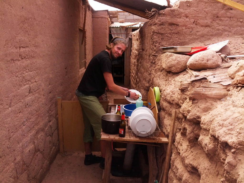 Má prý rád spojení s přírodou a San Pedro si zamiloval pro svou energii a nejkrásnější noční oblohu. Ráno jsme se pustili do úklidu dvora. Rodina nám připravila oběd a vzala nás na výlet autem do několika vesnic a pouštní oázy, kde teče řeka a dokonce tam rostou ovocné stromy. Další den už se rodina vracela do svého trvalého bydliště v Antofagastě. My jsme však dál mohli zůstat ve stanu na zahradě. Domluvili jsme se na poplatku za vodu a elektřinu, který byl oproti cenám hostelů velmi nízký. Byli jsme rádi, neboť atmosféra starého hliněného příbytku a zahrady byla kouzelná.