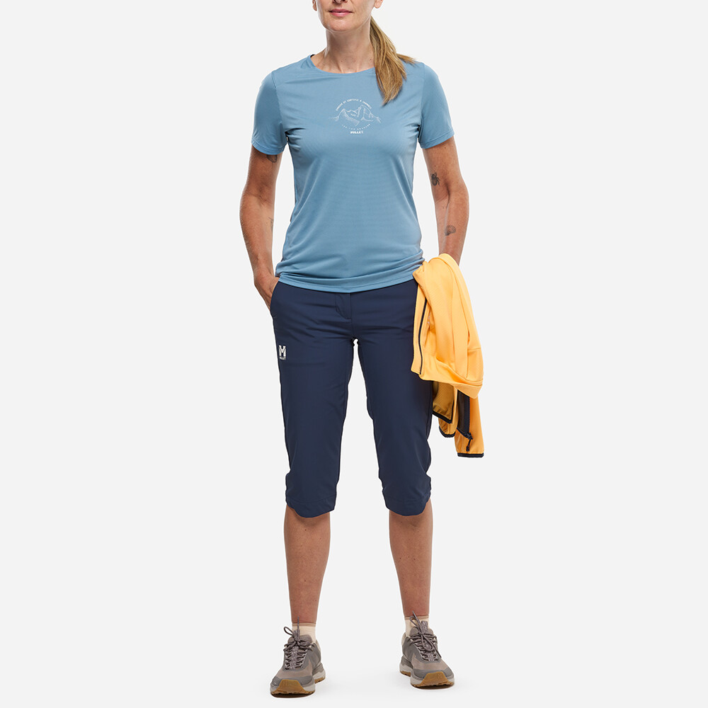 Lehký strukturovaný materiál ze 100% polyesteru efektivně odvádí vlhkost a rychle schne, takže zůstáváte v suchu i při celodenní námaze. Pohodlný, ženský střih s kulatým výstřihem dobře sedí při pohybu i odpočinku. Jemný horský motiv uprostřed hrudi připomíná alpské kořeny a know-how značky Millet.