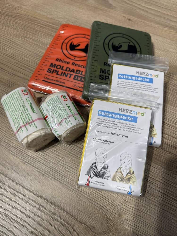 - Dále bychom měli mít ve výbavě alespoň dvě elastická obinadla. Určitě doporučuji dvě různé velikosti. Určitě se nám může hodit také tvarovatelná dlaha, kvalitní zdravotnické rukavice dvou různých velikostí, aby se případně potřeby daly navléct i přes rukavice a netrpěli jsme zimou. Na řešení hypotermie nebudeme potřebovat jen jednu izotermickou fólii, která většinou v základní výbavě bývá, ale hned dvě až tři folie. Jedna bývá v krizové situaci opravdu málo. Izofólie jako taková nehřeje, nevydává žádnou tepelnou energii, pouze odráží vaše zbytkové teplo zpátky a zabraňuje vnějším povětrnostním vlivům, aby vás o něj rychle připravilo. Aby to celé fungovalo co nejlépe, musíte zraněnou osobu zabalit opravdu důsledně, pečlivě od nohou až po hlavu. V ideálním případě kouká pouze obličej a dýchací cesty jsou částečně chráněny, ale musí zůstat průchodné, to je asi jasné.