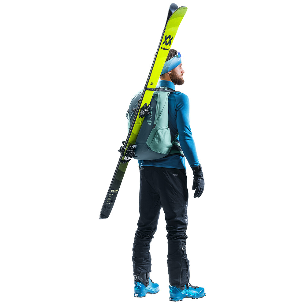 Nastavitelný diagonální systém připevnění lyží umožňuje jednoduchou a pohodlnou manipulaci a opět bez nutnosti sundat batoh, či rukavice. A pokud se chcete více kochat a vydáte se na túru bez lyží, můžete popruhy jednoduše odstranit a uložit.