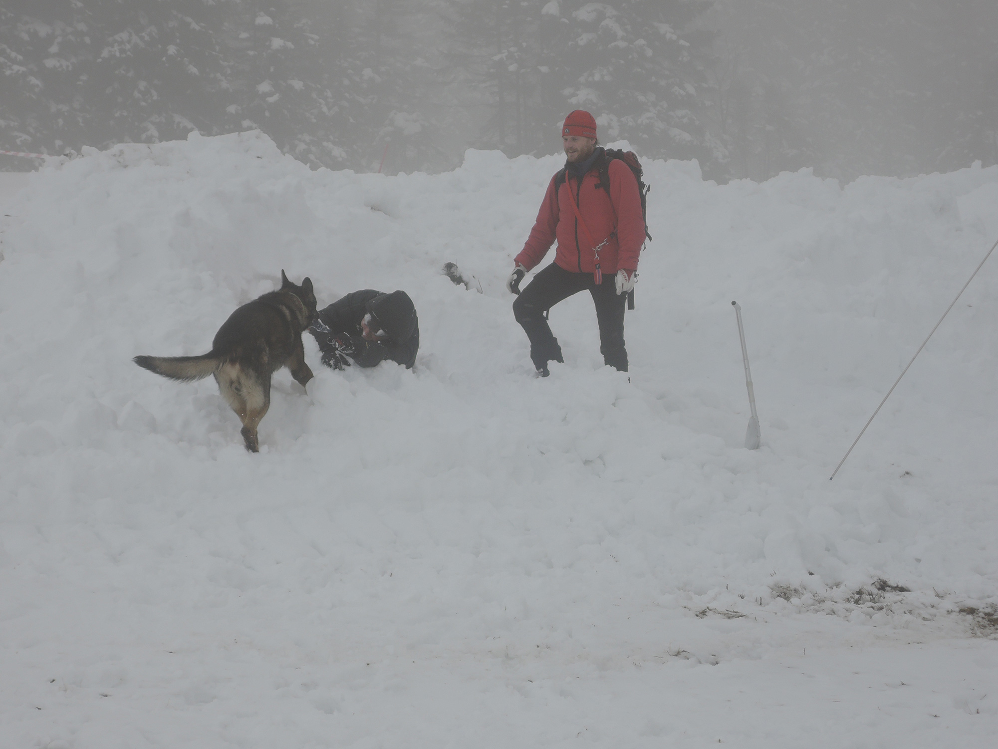 Následovala ukázka práce lavinového psa, pod vedením záchranáře a psovoda Horské služby Josefa Matějce. Stačila chvilička a Rys už vyhrabával zasypaného figuranta. Pokračovalo se s nácvikem správné techniky vyhrabávaní a vyproštění zavalené osoby a ukázkou první pomoci při lavinovém neštěstí.