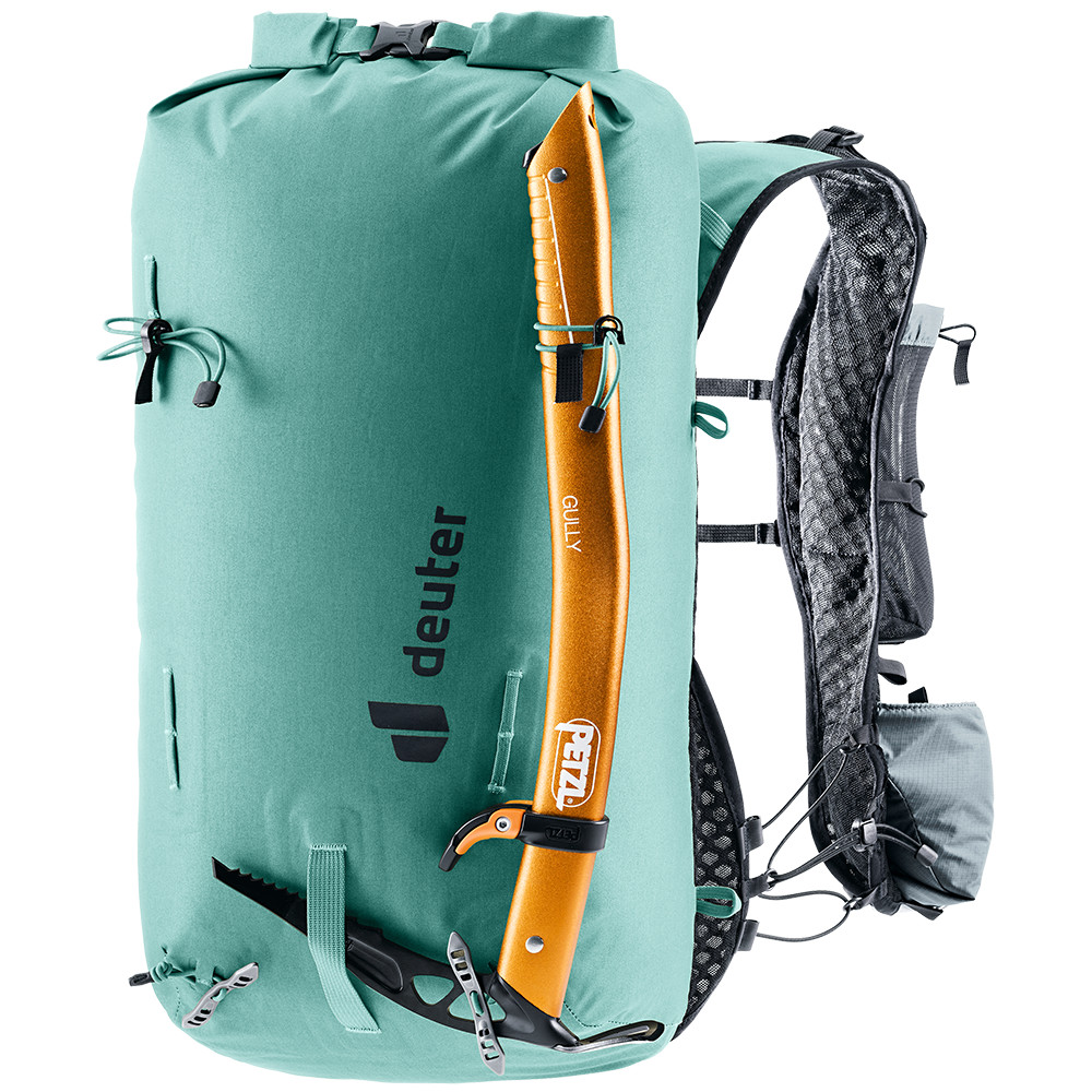 Batoh pro horolezce a skialpinisty. Má horní roll-top zavírání a boční vstupy na zip. Možnost nesení lana, cepínů, hůlek, lyží a součástí je držák na helmu. Bederní pás s poutkem na materiál.